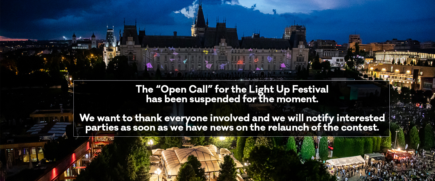 The ”Open Call” for the LightUp Festival has been suspended for the moment. We want to thank everyone involved and we will notify intererested parties as soon as we have news on the relaunch of the contest.