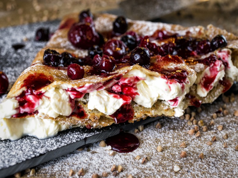 Enjoy a pancake prepared with buckwheat flour and chicken, turkey, bacon, beef, salmon, berries, oranges, apple, chocolate. Energize yourself with chicory juice, house lemonade or berry compote.