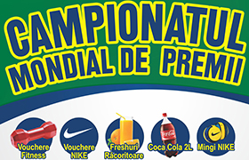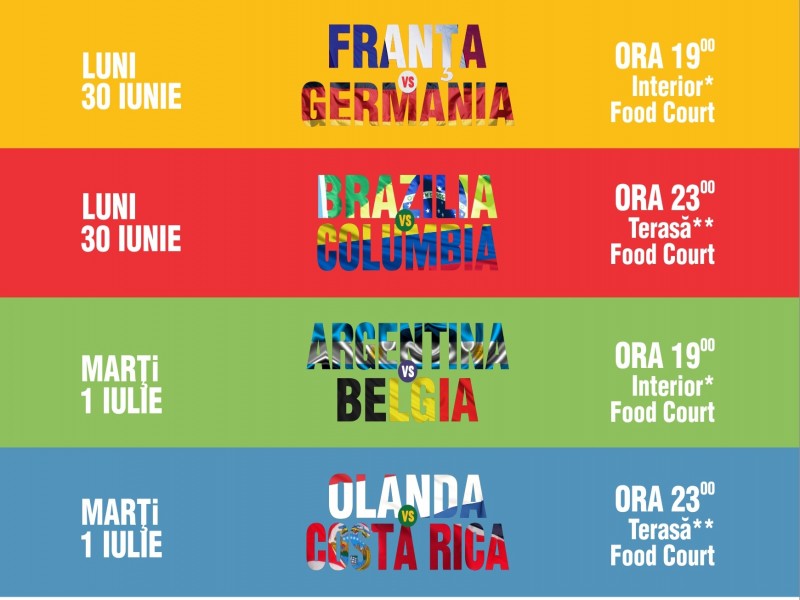 Te invitam la Campionatul Mondial de Premii. In fiecare zi vom difuza meciurile FIFA World Cup de la ora 19:00 in Food Court, iar de la 22:00 si 23:00 pe Terasa. Cei care vor fi prezenti de la ora 19:00 in Food Court vor avea ocazia sa castige multe premii atractive.