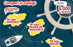 Cumpara de minim 150 lei si noi te premiem in fiecare zi cu un premiu instant si ai sansa sa castigi prin tragere la sort un sejur in Mykonos, Palma de Mallorca sau Malta.