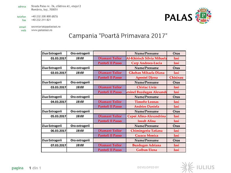 In acest an, ansamblul Palas sarbătoreste femeia timp de opt zile. „Poarta Primăvara” este indemnul campaniei special dedicata doamnelor și domnisoarelor, care se va desfasura în perioada 1 – 8 martie 2017. Clientii care cumpara in valoare de minimum 150 de lei din magazinele Palas Mall se pot inscrie la tombola cu surprize adorate de femei, la centrul de premiere special amenajat in proximitatea magazinului Guess.