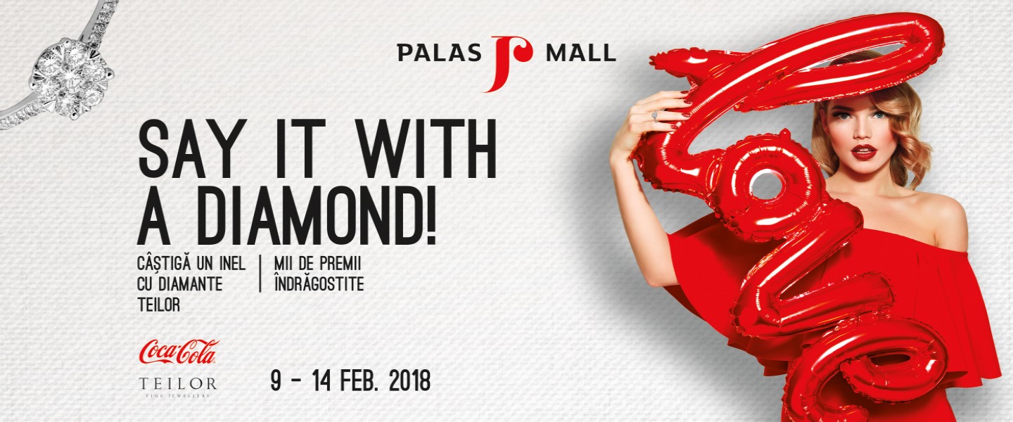 În perioada 9 – 14 februarie 2018, cei care cumpără în valoare de minimum 150 de lei din magazinele Palas Mall pot participa la campania „Say it with a diamond!”. Tot ce trebuie să facă este să se prezinte la centrul de premiere din zona Guess cu bonurile de cumpărături și vor fi înscriși în aplicația electronică. Celui mai norocos client, desemnat în urma extragerii din Ziua Îndrăgostiților, îi va fi răsplătită pasiunea pentru shopping cu un inel cu diamante Teilor, în valoare de 1.200 de euro.
