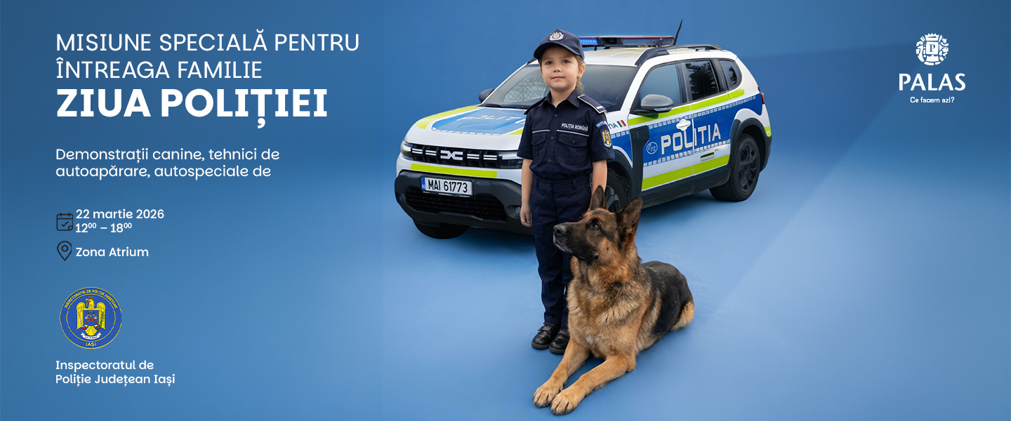 Patrula canină, demonstrații de autoapărare și tehnică de criminalistică, duminică, de Ziua Poliției Române, la Palas!