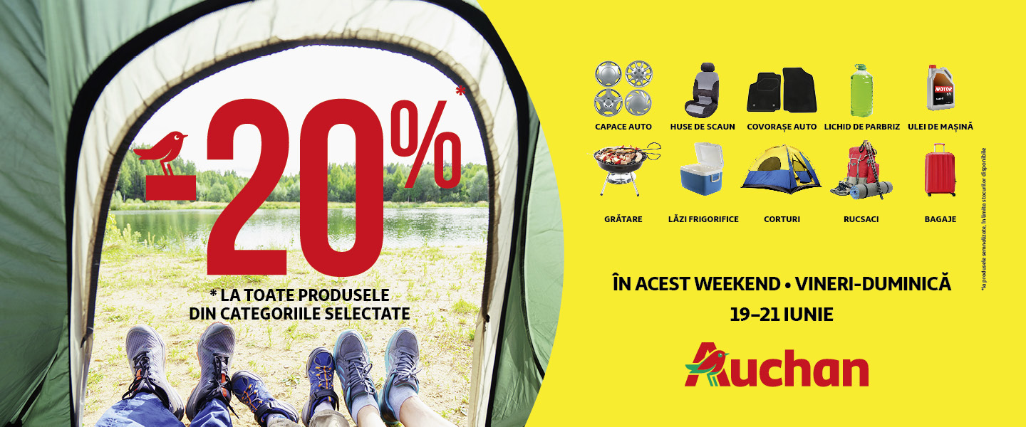 hipermarketul Auchan vă așteaptă cu -20% reducere la toate produsele din categoriile: huse pentru scaune auto, capace roți auto, covorașe pentru mașină, lichid de parbriz, ulei pentru motor, grătare, lăzi frigorifice, corturi, rucsaci, genți de voiaj.