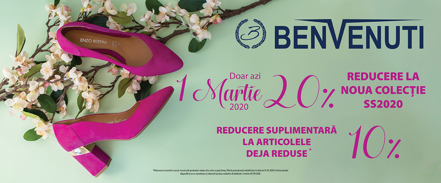 Pe 1 Martie, Benvenuti îți oferă 20% reducere la colecția nouă Primăvară – Vară 2020 și extra 10% reducere la articolele deja reduse, indiferent de colecție.