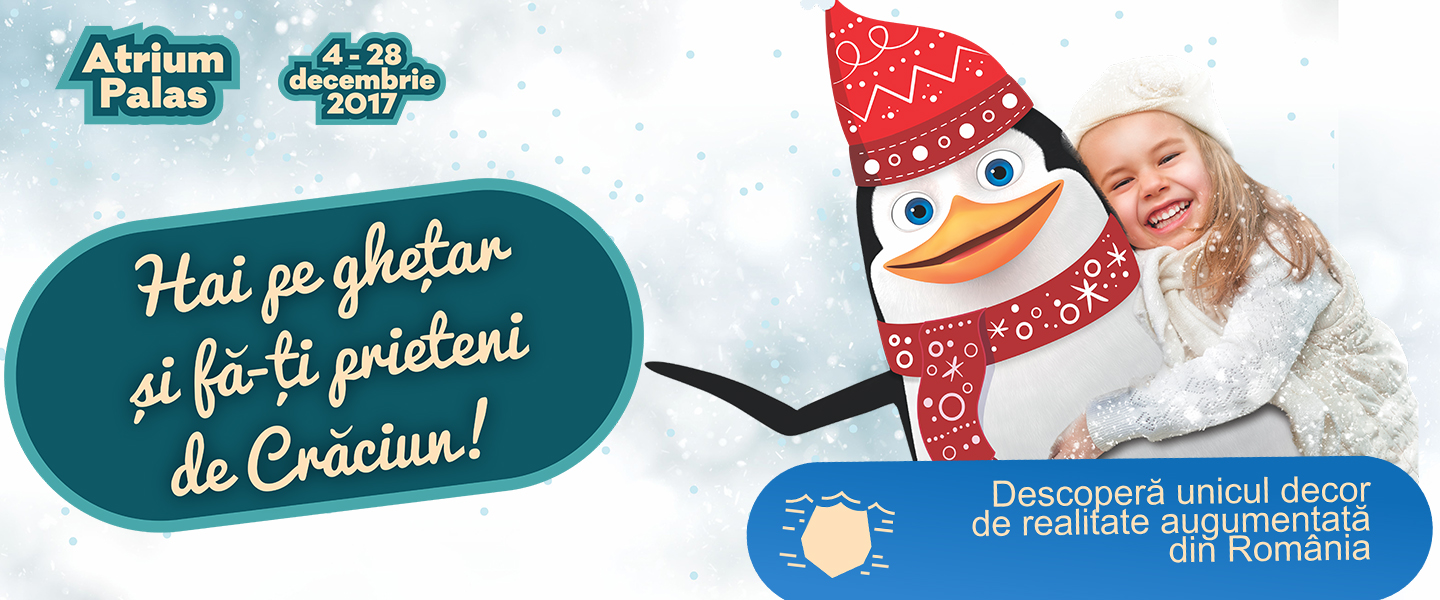 Pana pe 28 decembrie 2017, te așteptăm în atrium, să-i cunoști pe cei mai simpatici prieteni ai Moșului: pinguini, urși polari și foci. Vino să te bucuri de o experiență extraordinară, într-un decor de realitate augmentată, unic în România. Te așteptăm să descoperi toate curiozitățile despre aceste personaje și să te fotografiezi cu ele!