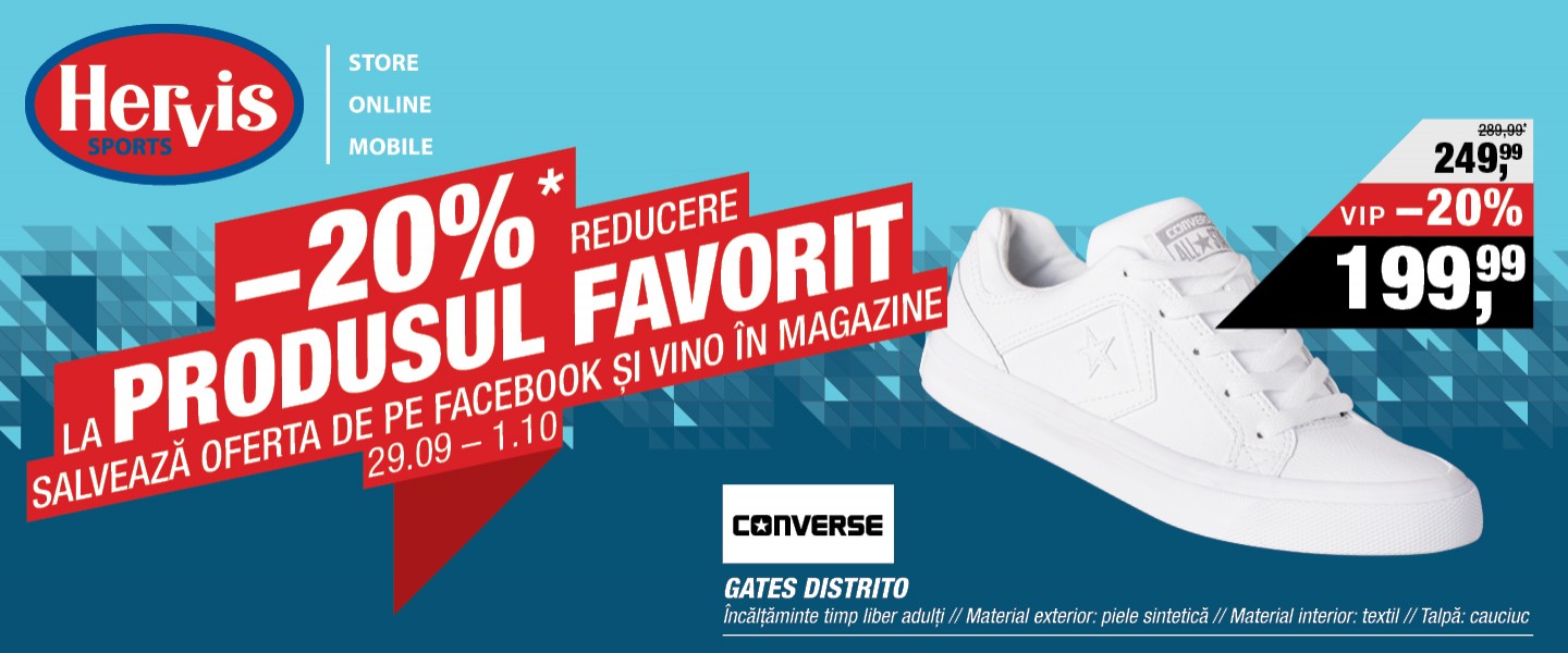 La Hervis primești 20% reducere la produsul tău favorit în perioada 29 septembrie - 1 octombrie! Ce trebuie să faci? Salvează oferta de pe Facebook și vino în magazine pentru a profita de reducere.