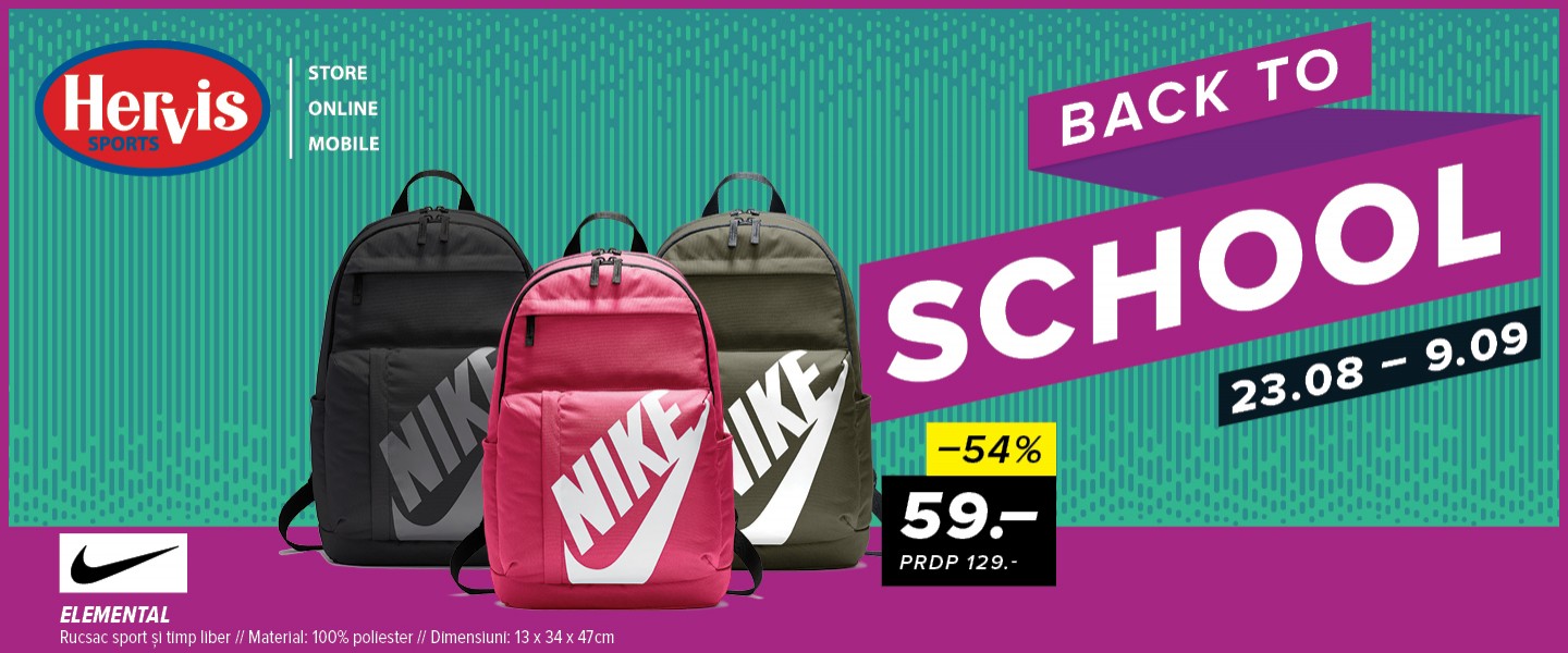 Noul an scolar incepe cu super oferte la Hervis Sports! Vino sa iti iei Rucsac Nike la doar 59,99! Intre 23.08 - 09.09 in magazine si online pe hervis.ro! Hervis Sports store online mobile