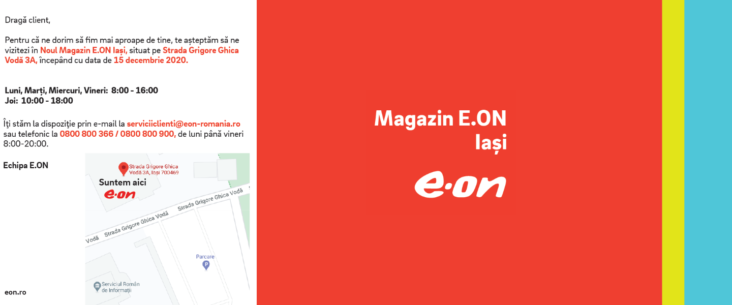 - adresa de e-mail: serviciiclienti@eon-romania.ro