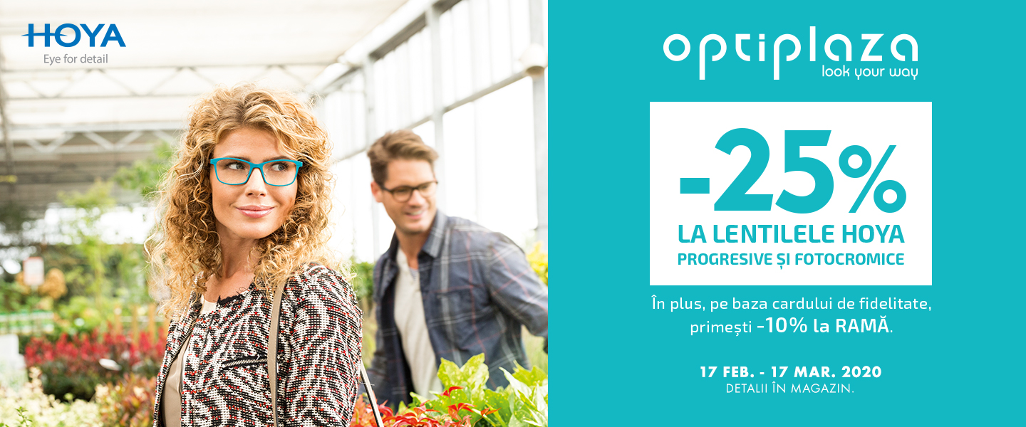 În perioada 17 februarie – 17 martie, magazinul Optiplaza va avea o reducere de 25% la lentilele Hoya progresive și fotocromice. În plus, pe baza cadrului de fidelitate, clienții mai beneficiază de -10% la ramă.