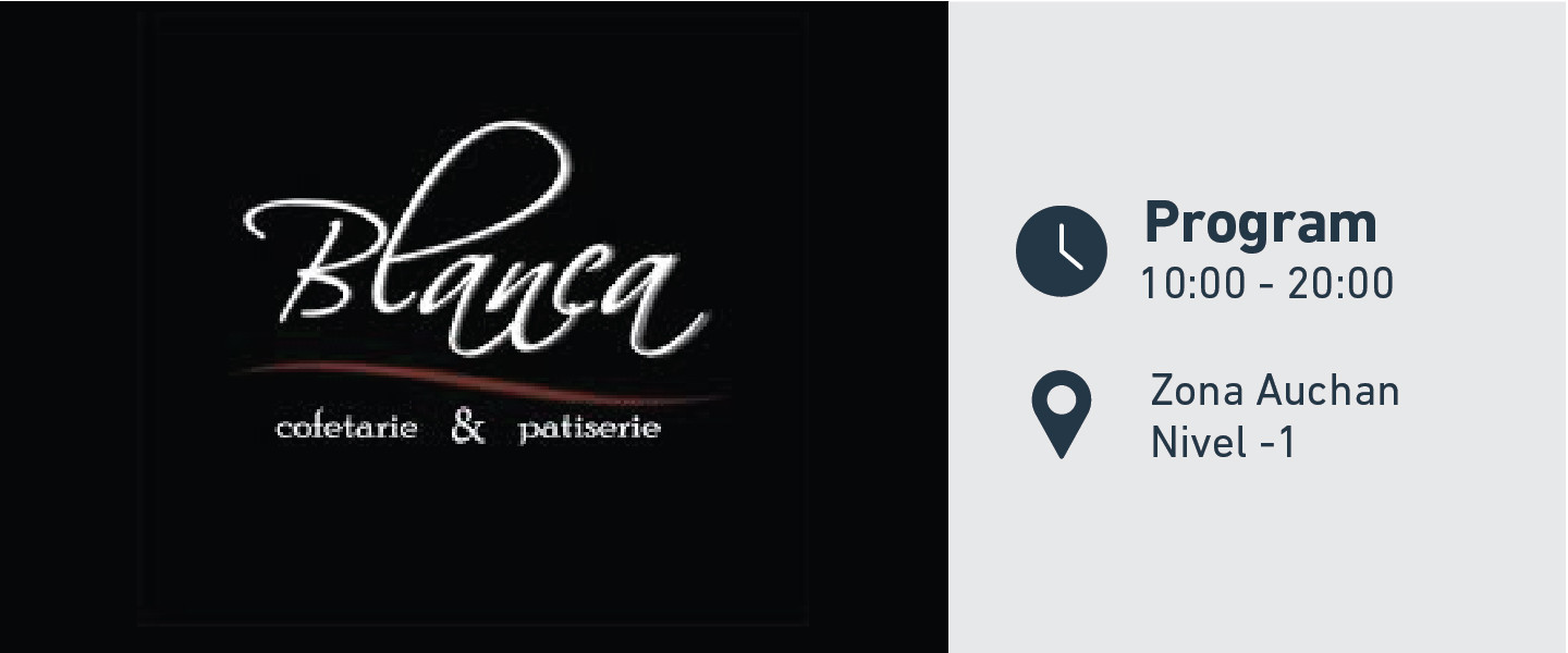 Cofetăria Blanca, situată în zona Auchan, este deschisă zilnic între orele 10.00 - 20.00 și vă așteaptă cu prăjituri și torturi delicioase, pentru momente dulci în familie.