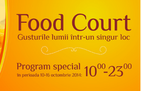 In perioada 10 - 16 octombrie programul la Food Court va fi prelungit pana la ora 23:00.