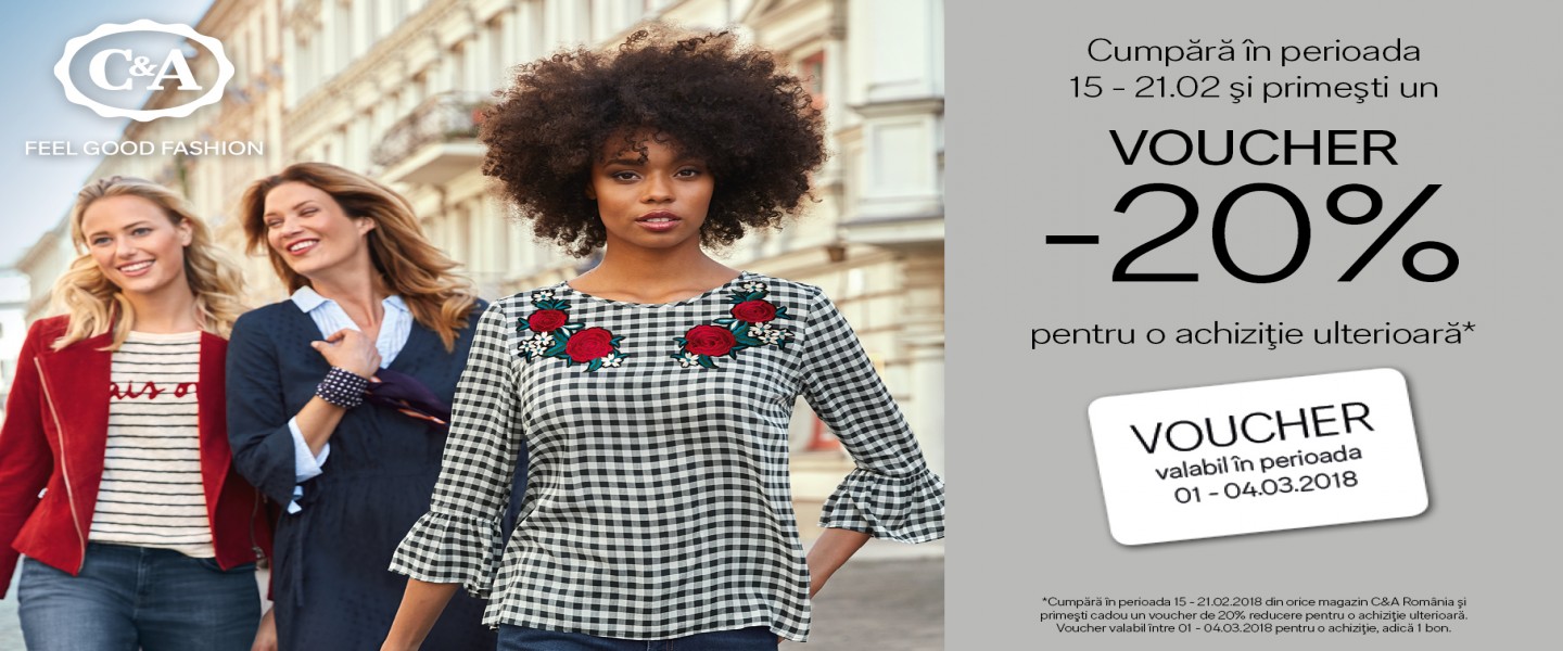 C&A te pregateste de Primavara si iti face cadou pentru orice achizitie realizata în perioada 15 - 24 Februarie, un voucher de 20% reducere!