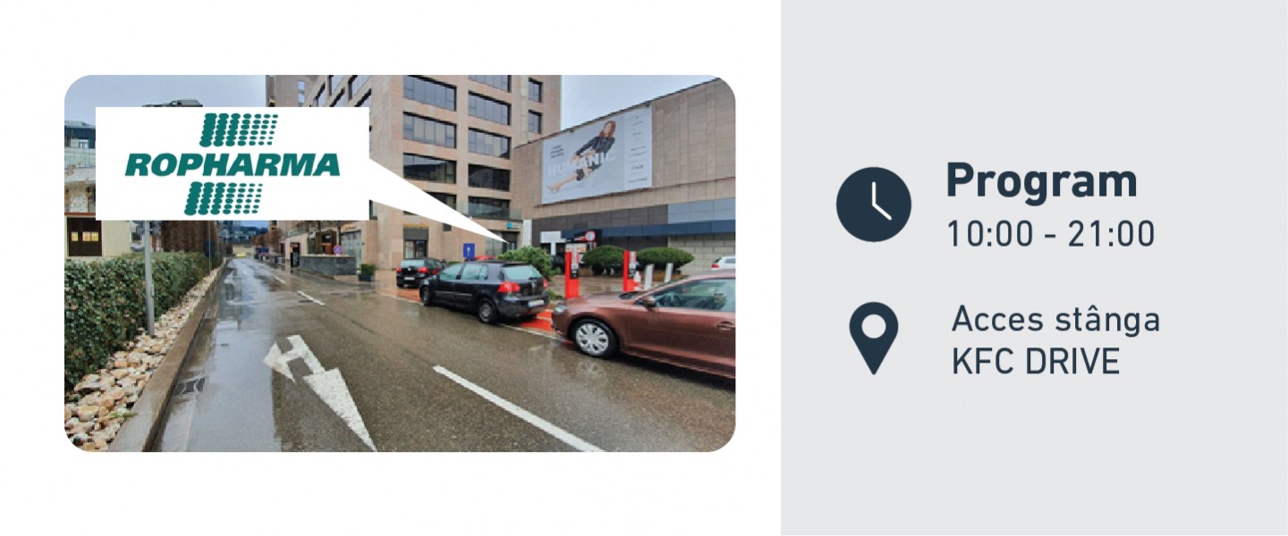 Farmacia Ropharma are program zilnic între orele 10.00 - 21.00, iar accesul se va face prin partea stângă a KFC Drive.