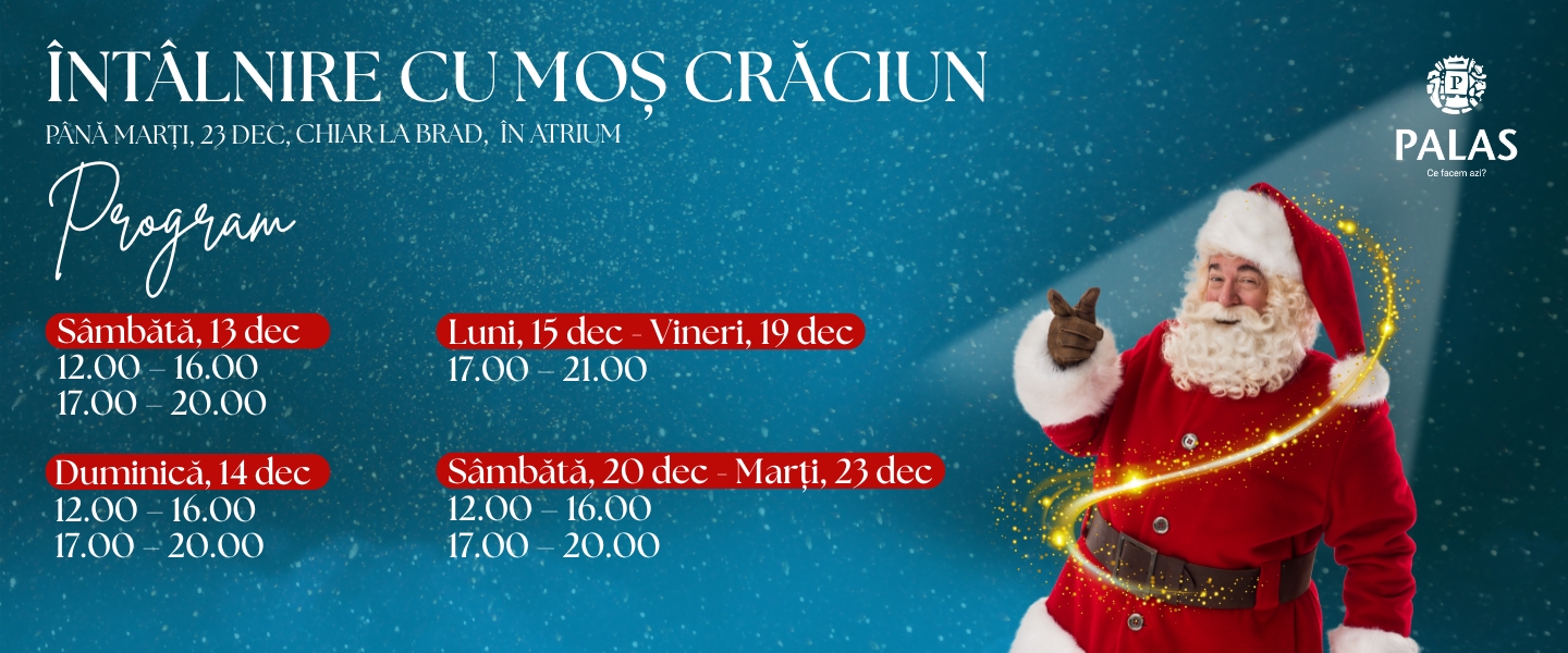 Magia sărbătorilor prinde viață la Palas. Moș Crăciun îi așteaptă pe cei mici și pe cei mari în Atrium, chiar lângă brad, pentru momente de poveste, fotografii și zâmbete.