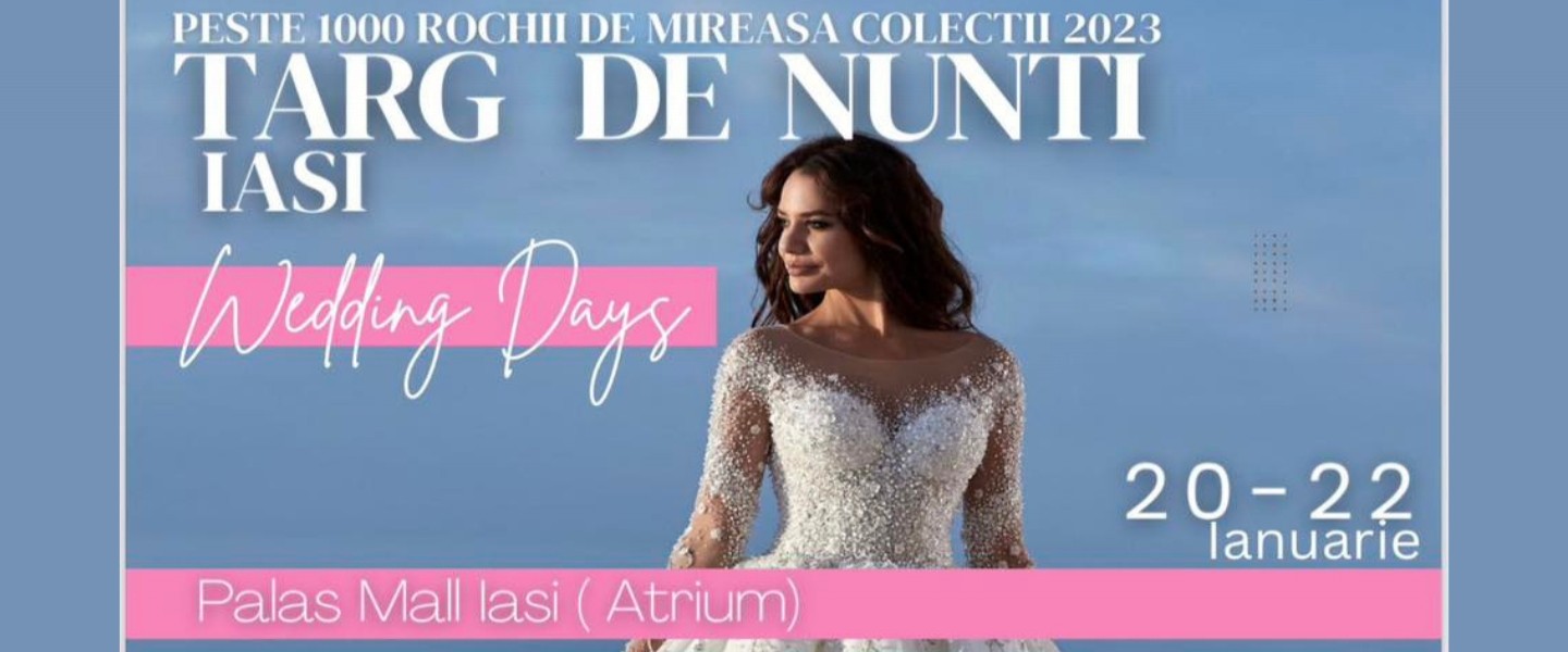 Participarea la târgurile de nunți este un „must go” pentru miri, iar în perioada 20-22 ianuarie 2023, la Wedding Days din Palas Iași, găsești tot ce ai nevoie pentru a începe pregătirile de nuntă. Ca să-ți fie mai ușor, fă-ți un checklist, ia-ți timpul necesar pentru a vorbi cu furnizorii și nu rata niciun stand pentru că toți au pregătit surprize.