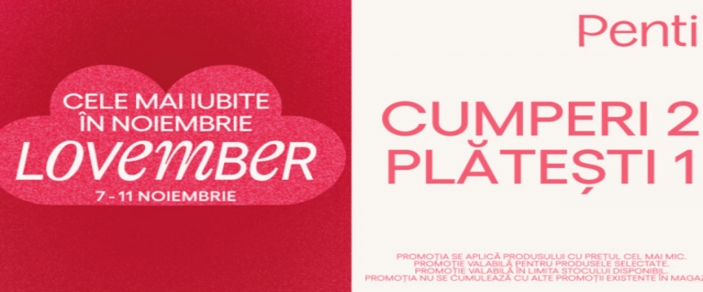 În perioada 7 – 11 noiembrie, Penti sărbătorește Lovember cu o ofertă irezistibilă: cumperi 2, plătești 1! Profită de această promoție specială și bucură-te de cele mai iubite articole Penti, dar grăbește-te, oferta este valabilă doar în limita stocului disponibil!